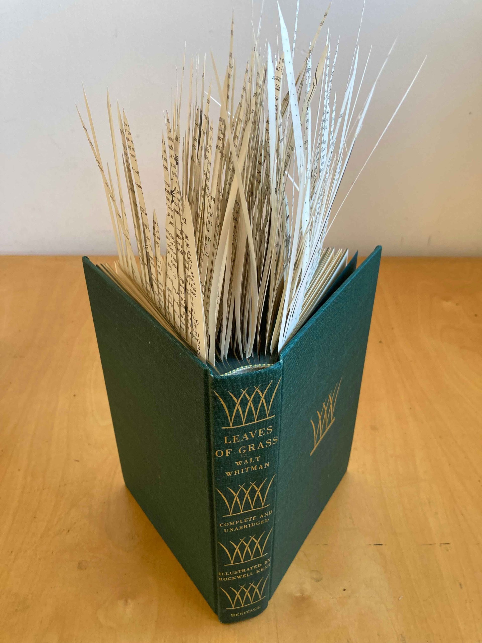 Walt Whitman is a beloved poet, excessive in his unrestrained use of words, his profane reverence for nature, his unbridled methods of verse, his irreverence for society, his candid exploration of sexuality, and his copious growth of whiskers. I honor Whitman with this volume of his most celebrated and free verse: “Leaves of Grass.” I summon his spirit with leaves of grass cut from his own verses. Considered irreverent and criminal by bibliophiles, the alteration of this volume calls forth Whitman’s spirit with the utmost respect.